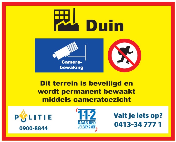 De borden als je Duin oprijdt, zijn inmiddels aangepast. Vanaf nu vind je hier de juiste informatie om samen ons bedrijventerrein veilig te houden. Zie je iets verdachts of neem je wat raars waar, laat het dan weten op telefoonnummer 0413 34 77 71